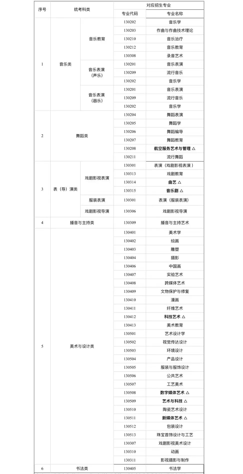 1. 专业名称后标记“△”的,相关招生高校可对应该专业在我市所属的统考科类,也可根据人才培养需要,跨科类科学确定该专业与我市其他统考科类的对应关系,由招生高校在招生章程中向社会公布。具体招生专业以我市当年公布的招生计划为准。