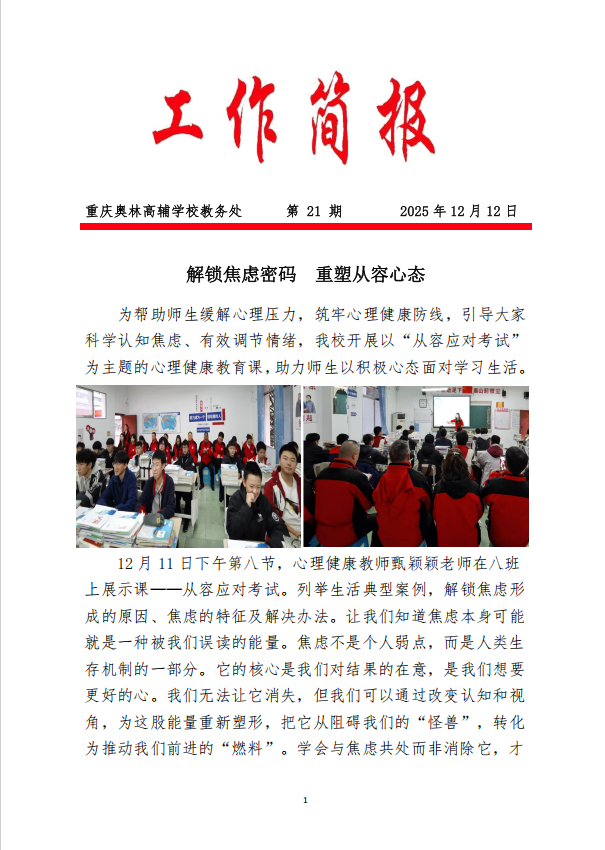 重庆奥林高辅学校开展以“从容应对考试”为主题的心理健康教育课
